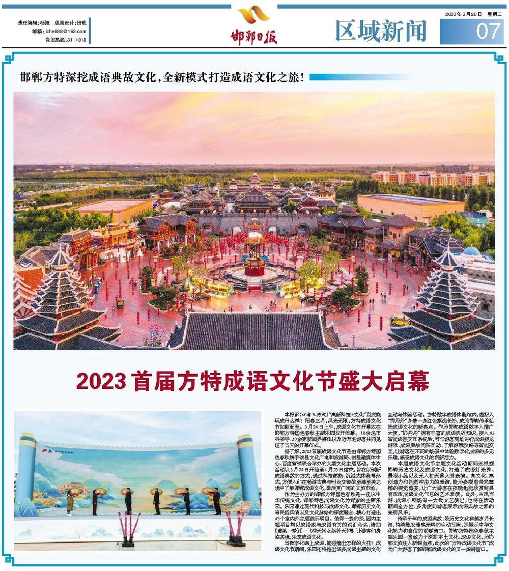 本報訊(記者王艷超)“高新科技+文化”到底能玩成什么樣?陽春三月,風光無限,方特成語文化節如期而至。3月24日上午,成語文化節開幕式在邯鄲方特國色春秋主題樂園拉開帷幕。10余名市縣領導、30余家新聞界媒體以及近萬名游客共同見證了當天的開幕儀式。據了解,2023首..