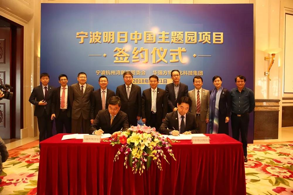 寧波市人大常委會副主任、寧波杭州灣新區黨工委書記俞雷,寧波杭州灣新區黨工委副書記、管委會副主任徐方,新區管委會副主任蔡世杰參加。華強集團股份董事局副主席李明、華強集團董事長張恒春、華強方特集團董事長戎志剛等參加簽約儀式。