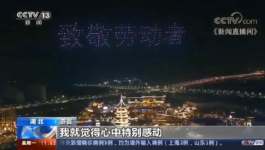 據(jù)央視新聞頻道報道,荊州方特的“無人機光影秀吸引了不少游客前來打卡”,有游客在現(xiàn)場接受采訪時表示,這場活動“很好看,而且也特別感人,特別是出現(xiàn)‘荊州你好’,‘愛湖北,愛荊州’等字眼,就覺得心中特別感動”。