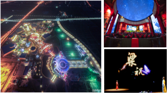 左-寧波方特東方神畫夜景,右上-全景式動態(tài)球幕項(xiàng)目《牛郎織女》,右下-全息AR劇場《千古蝶戀》