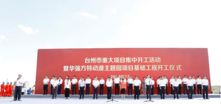 7月9日臺州市舉行了重大項目集中開工活動暨華強方特動漫主題園項目基礎工程開工儀式,臺州市委書記陳奕君,市委副書記、代市長張曉強,市委常委、常務副市長董貴波,臺州灣產業集聚區管委會主任黃繼滿,華強方特集團總裁劉道強等出席開工儀式。