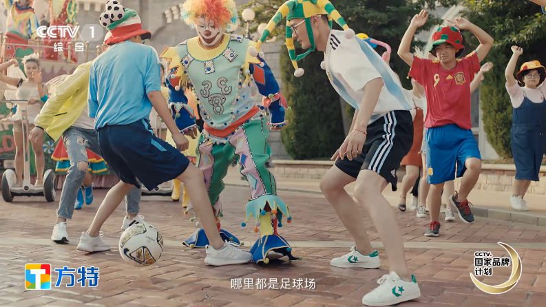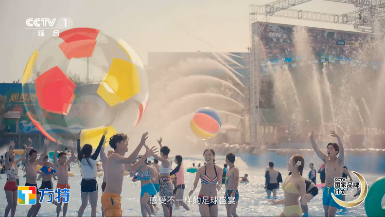 在央視的一分鐘宣傳片中,華強方特通過讓動漫明星熊大、熊二化身球員,方特化身“足球場”,吸引眾多游客歡樂互動,感受體育競技的魅力。而走進(jìn)方特主題樂園,游客不僅可以看到掛滿球隊旗幟的鮮花大道,活力十足的足球?qū)氊悾€可以親身參與到“嗨啤世界杯”、“水球運動會”等系列足球活動中,狂歡一夏。