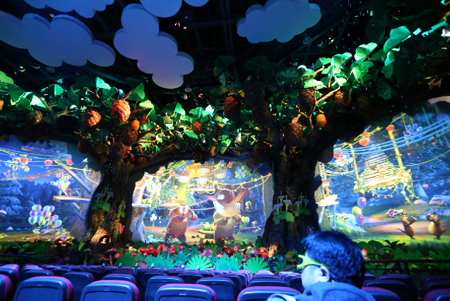 《熊出沒劇場(chǎng)》中的座椅設(shè)置在大型旋轉(zhuǎn)平臺(tái)上,平臺(tái)前后有兩組可展示不同內(nèi)容的大屏幕。隨著情節(jié)演變,游客們將在兩組屏幕的自由轉(zhuǎn)換中觀賞影片。綜合實(shí)物景觀和大型機(jī)械動(dòng)作模型的環(huán)境4D劇場(chǎng),結(jié)合煙霧、光電等多種特技,通過這些創(chuàng)新前衛(wèi)的形式演繹引人入勝的劇情,《熊出沒劇場(chǎng)》讓游客們走進(jìn)一個(gè)有聲、有色、更有真實(shí)感的“熊出沒”童話,一同感受純真,體驗(yàn)美好,分享笑聲。不僅如此,故事還巧妙地傳遞自然、環(huán)保、健康、快樂的理念,寓教于樂,讓大朋友與小朋友們都能收獲滿滿。
