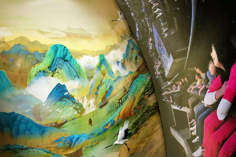 丁亮還現場分享了方特今年限時推出的飛翔球幕影院項目《飛越千里江山》。該項目以中國傳統青綠山水畫為題材,呈現高科技與中華文化瑰寶融合迸發的無限魅力?!讹w越千里江山》在今年8月一經發布,便立即成為業界、專家、媒體與公眾關注的焦點,吸引大批游客慕名前往體驗。